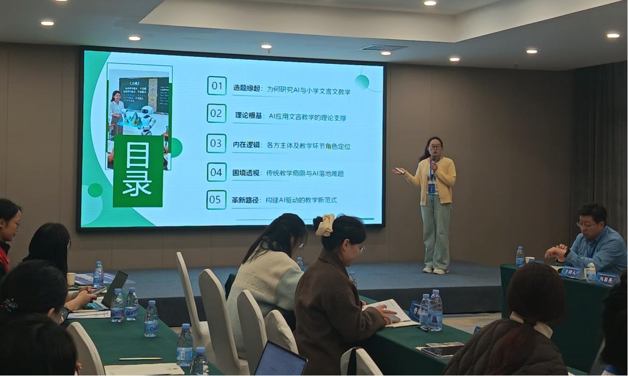 在分论坛二“数智时代的教育变革探索”的交流环节中,我校小学教育专业硕士研究生程梦婷同学代表平顶山学院登台发言。她以《人工智能赋能小学语文文言文教学模式的创新》为主题,结合理论探索与实践观察,既剖析了当前文言文教学的痛点,又分享了借助AI技术优化课堂设计、提升学生文化感知力的创新思路,报告获得了点评专家的肯定。