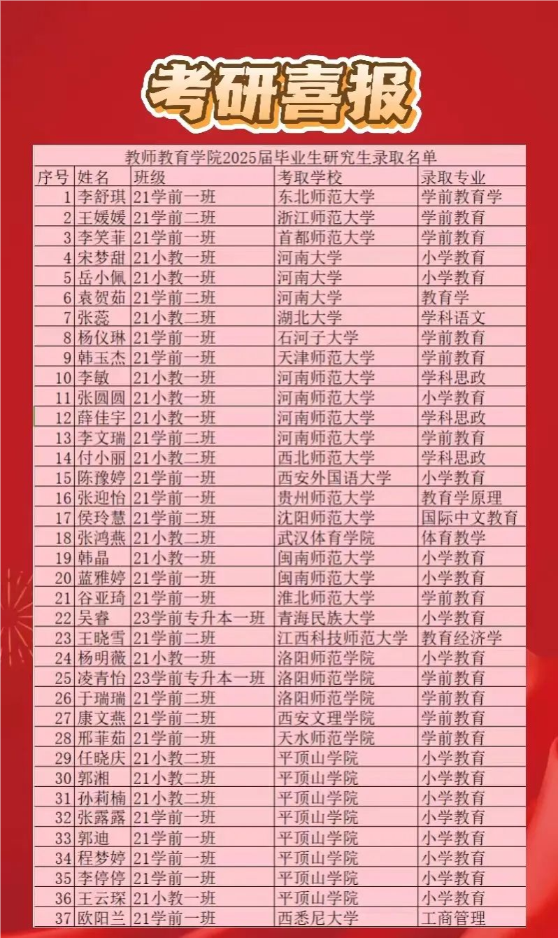 热烈祝贺教育学院2025届考研学子再创辉煌!今年共有37名同学成功考取硕士研究生,同比去年19人,上岸率增加94.7%,创学院历史新高!